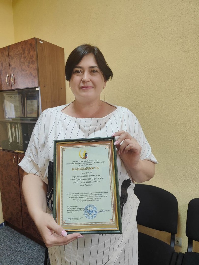 По результатам работы в 2023-2024 учебном году, учитывая высокую роль деятельности аграрных классов в осуществлении профессиональной ориентации обучающихся и повышении престижа сельскохозяйственных профессий, коллективы ГБОУ «СШ № 99 г.о. Макеевка», ГБОУ «СШ № 60 г.о. Макеевка», ГБОУ «Благодатновская школа Амвросиевского муниципального округа», ГБОУ «Хлебодаровская школа Волновахского муниципального округа», ГБОУ «Средняя школа села Розовка Шахтерского муниципального округа» получили благодарности от лица и.о. заместителя Председателя Правительства Донецкой Народной Республики – министра агропромышленной политики и продовольствия Донецкой Народной Республики Артема Александровича Крамаренко.